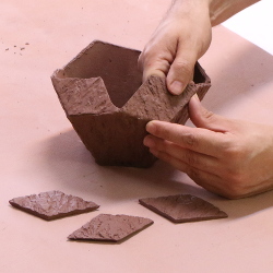 The vases and jars use patterns created by software Tim designed and created himself. Using cardboard templates, clay slabs are cut into pieces and then patterned using the bark texture molds. Once they have dried a bit, the pieces are joined together to make the complete piece.